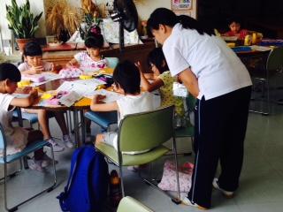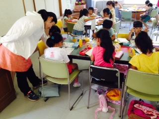 たくさんの児童が参加し、エアコンが設置してあるランチルームやパソコンルーム等で一生懸命に学習しています。ボランティアの学生もお手伝いに来てくれています。