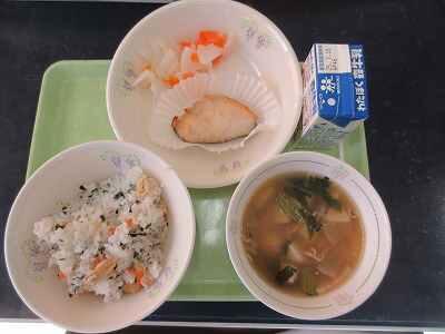 今日から給食も始まりました。久しぶりの給食です。今日の献立は『わかめごはん、牛乳、さわらの西京焼き、かぶと大根の甘酢漬け、白玉雑煮』です。ある児童に「おいしい?」と聞くと、「おいしいです。」と笑顔で答えてくれました。