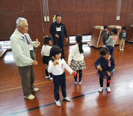 地域の方をお招きして、いっしょに遊ぼう会が行われました。けん玉やこま回しに苦戦していましたが、コツを教えていただきながら、昔遊びを楽しむことができました。