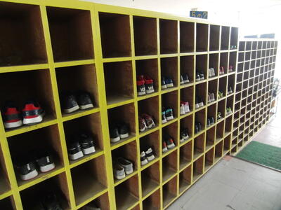 学級によっては当番や係の児童が確認してますが、そうでなくてもきちんとかかとがそろっています。