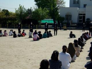 始めに新しい先生の紹介をして、そのあと、始業式を行いました。