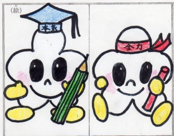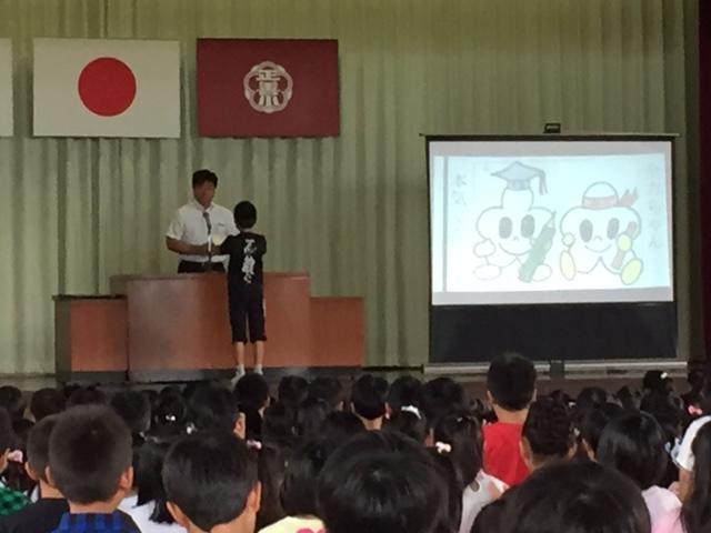 児童からに公募していた正善小のマスコットが決定し、最優秀賞として表彰されました。児童の投票で選ばれたマスコットは、2年生天野くんの作品「本気くん・全力ちゃん」でした。
