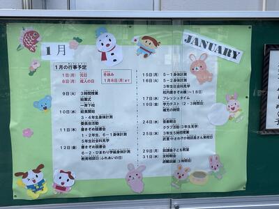 正門前の掲示板には、1月の予定表が貼られて、新学期の準備ができています。