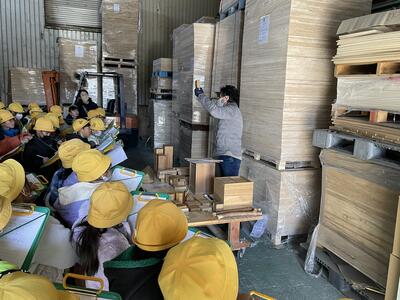 工場内の見学を行っています。桐箱を組み立てるところや、木を切ったり削ったりする道具や機械を見せてもらいました。