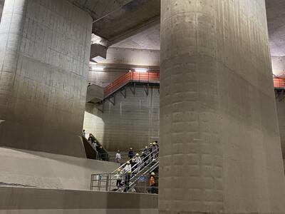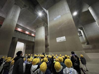首都圏外郭放水路の機能や役割について説明を聞いています。