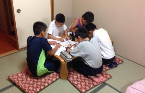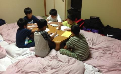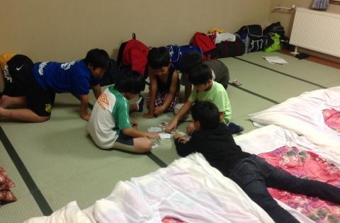 あいにくの雨でほたる見学はできませんでしたか、最後の夜を部屋レクで楽しんでいます。トランプをしたり、林間学校学校しりとりを夢中になって書いたり‥