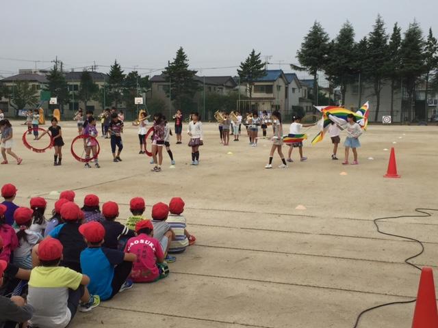 10月9日に出場する埼玉県鼓笛金管バンド中央大会で演奏、演技する内容を全校の前で発表しました。本がんばって、すばらしい演奏、演技を期待しています。