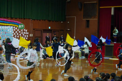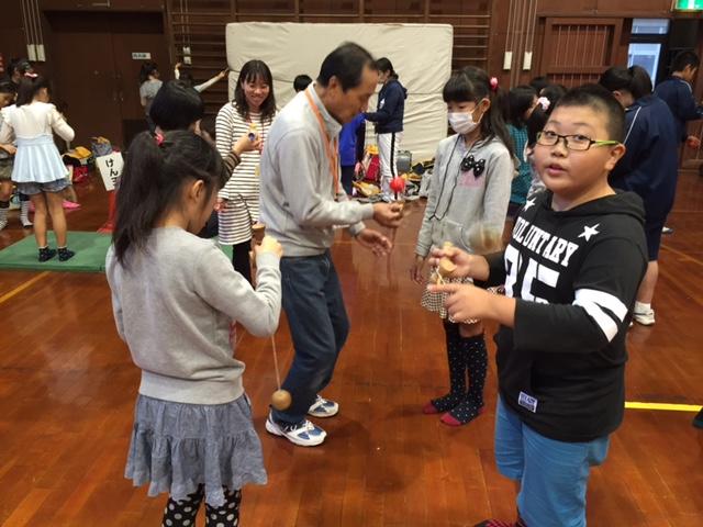 1年生でいっしょに遊ぼう会を行いました。地域の敬老会の方々にお越しいただき、むかし遊びを教えていただきました。とてもやさしく親切に教えていただき、子どもたちはえがおいっぱいで遊んでいました。