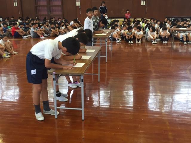 朝の活動で仲よし集会を行いました。縦割りグループで、各教室を回り、協力して課題を解決するスタンプラリーを行いました。