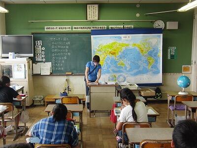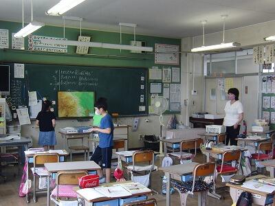 高学年は、集中して外国語の授業を受けています。予防対策のために、十分な発音の学習ができませんが、先生方のおかげで楽しく学んでいます。