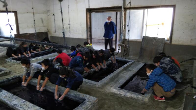 武州中島紺屋さんで、藍染め体験を行いました。染める工程で、水に漬け込みましたが、とても冷たかったようです。自分だけのオリジナルハンカチが出来上がりました。