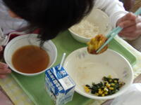 かぼちゃをベースにさつま芋やたまねぎの入った食べ応えのあるコロッケで、みんなおいしそうに食べていました。