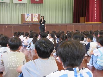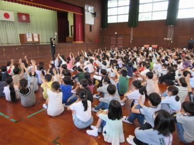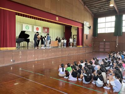 今日は音楽朝会がありました。今月の歌「にじ」を手話をしながら、全校で歌いました。どの学年も、手話をしっかりしながら、元気に歌うことができました。