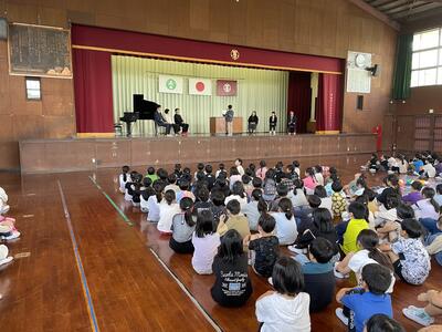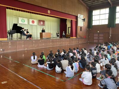 オーケストラの演奏者の方々が来校して、楽器の紹介や演奏をしてくれました。楽器クイズや指揮の練習、パーカッションの練習など、楽しいワークショップとなりました。本公演が楽しみです。