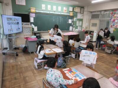 教室では、1年生が学校探検で見学した特別教室を紹介していました。