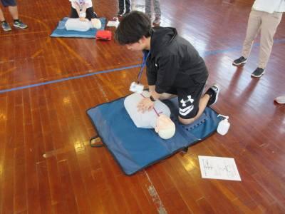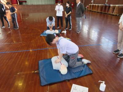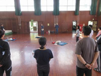 6月になるとブール開きをし、水泳学習が始まります。それに向け、今日は、春日部消防署の方に来校いただき、職員が救命法講習会を行いました。