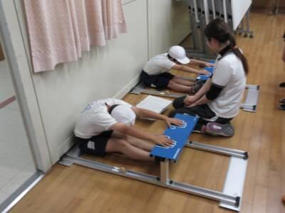 今週は新体力テストを実施しています。4年生が「長座体前屈」を測定していました。