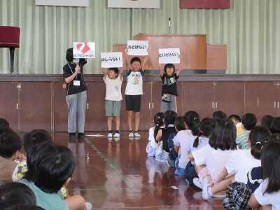 今日から本校の読書週間が始まりました。児童集会では、図書委員会が「本大好き集会」を行いまいた。寸劇やクイズで、おすすめの本を紹介してくれました。