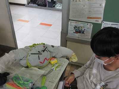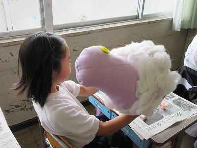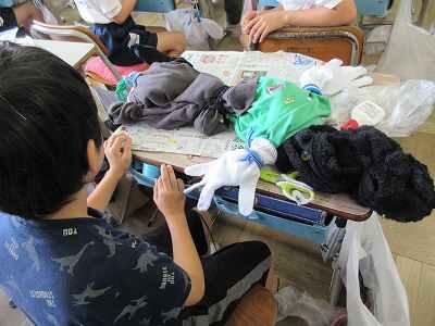 3年生は、図工の時間。古着を活用して、いろいろな作品を作っていました。