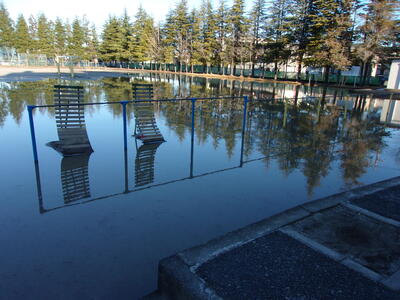 朝のうちは校庭も大きな水たまりが湖のようになっていました。