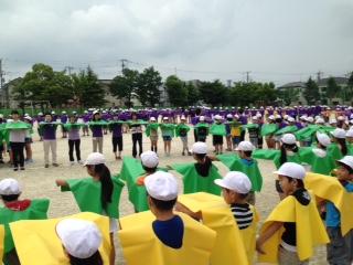 開校40周年記念の航空写真撮影を行いました。全校児童と職員、PTA役員さんが、カラーエプロンを着て、デザインを作りました。