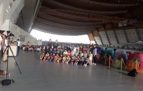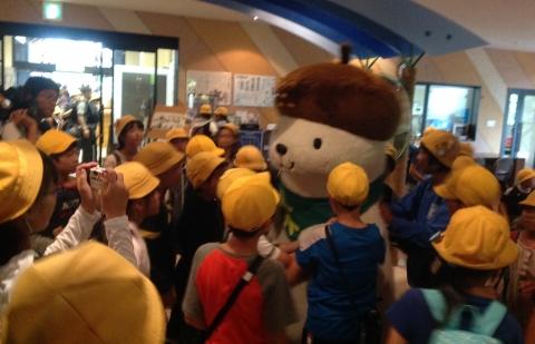 志賀高原観光PRキャラクターの「おこみん」が現れ、大喜び!
