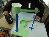 5年生は図工の時間に何やら立体的な作品を作っています。どうやら、ビー玉の転がる道を作っているようです。