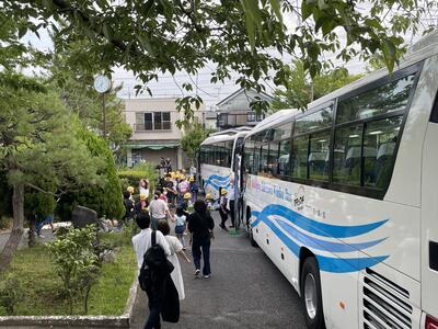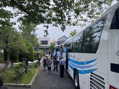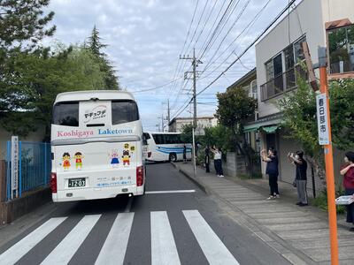 5年生の林間学校のバスが、山梨県へ向けて学校を出発します。