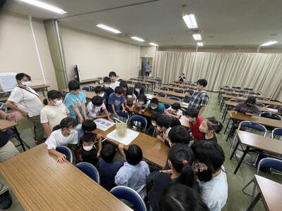 川の水に薬品(凝集剤)を入れて、汚れを固めて沈殿させる実験をしています。