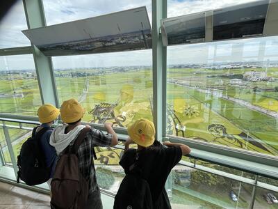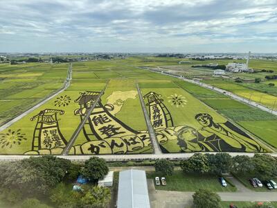田んぼに、黄色や黒の米で色分けをして、見事な絵が描かれています。子供たちも驚きの声を上げています。