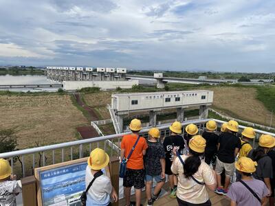 建物の屋上から利根川や、利根大堰、水路の様子を見学します。