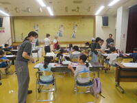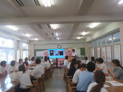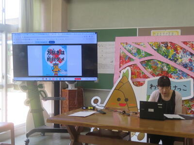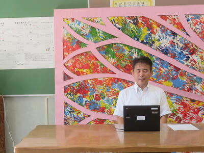 暑さを考慮し、オンラインでわかたけホールと各教室をつないで行いました。