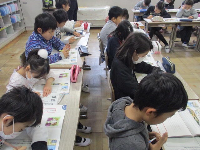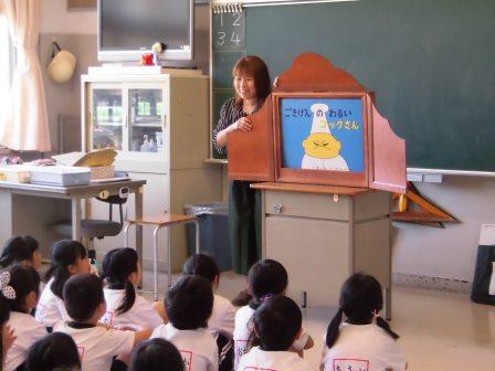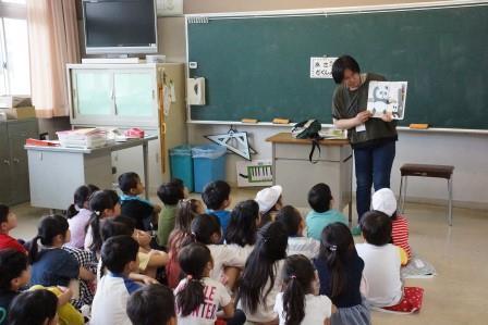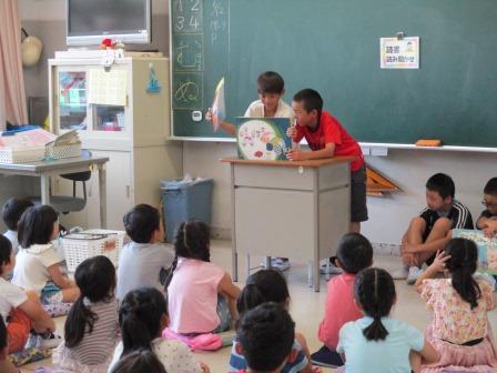 今年初めての「図書委員児童による読み聞かせ」が行われました。5年生、6年生の図書委員児童が1・2年生の各クラスに入り、紙芝居や絵本の読み聞かせを行いました。図書委員児童にとっては、このような取り組みを通じて高学年としての自覚が、低学年の児童にとっては、高学年への尊敬・あこがれの気持ちが、それぞれ芽生えたことでしょう。