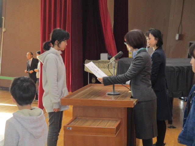 6年間、無欠席、無遅刻、無早退で学校生活を送った6年生児童1名に、ライオンズクラブから、表彰状、筒、記念品が授与されました。友だちから、大きな拍手で祝福された男子児童。4月からの中学校生活でも、皆勤を目指してほしいと思います。