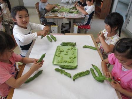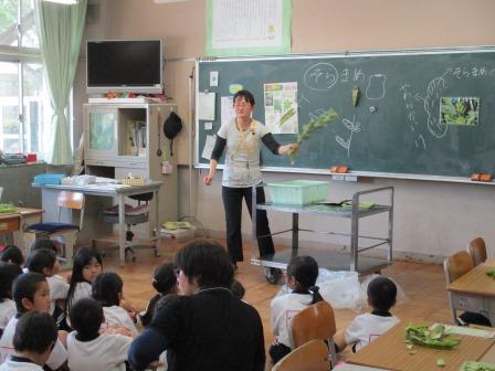 今日の1時間目に、1年生が「そらまめのさやむき体験」をしました。栄養士の先生から、そらまめのこと、さやのむき方などを教えていただき、子どもたちは手際よく、あっという間にさやをむき終えていました。1年生が一生懸命にさやをむいた「そらまめ」が給食に出て、みんなとても美味しそうに食べていました。
