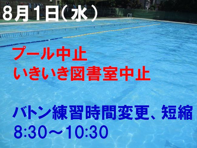 8月1日プール、いきいき図書室中止、バトン練習時間変更・短縮