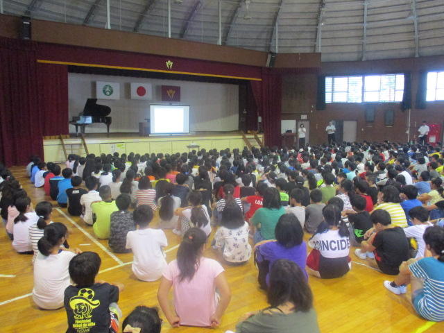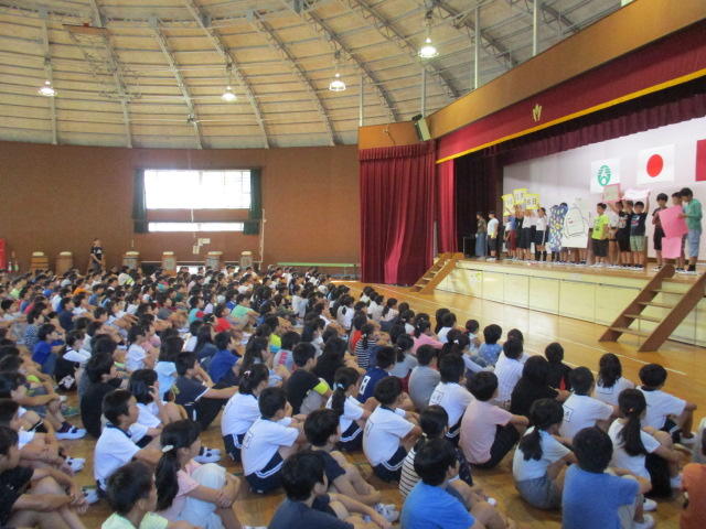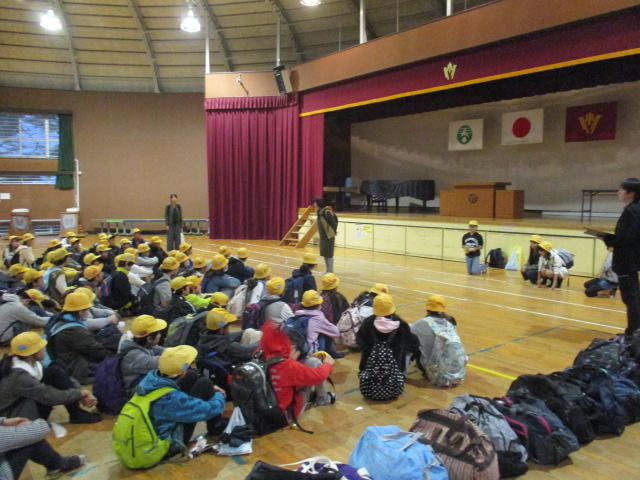 修学旅行二日目も無事に終わり、体育館で到着式が行われました。子供たちは、この二日間の経験をこれからの生活に活かしてくれることと思います。保護者の皆様におかれましては、準備、お見送り、お迎え等、誠にありがとうございました。