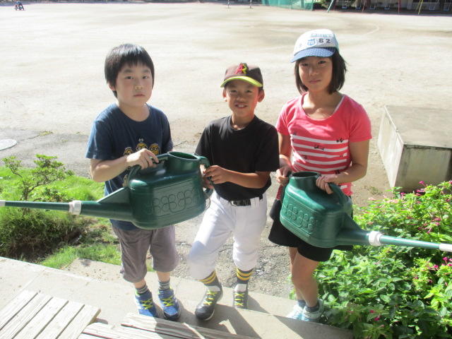 16日(日)の早朝、高学年の子供たちが職員室にやってきて、「ジョーロと烏骨鶏小屋の鍵を貸してください」と言ってきました。話を聞いてみると、連休中なので、植木鉢の植物や烏骨鶏が心配でやってきたとのことでした。生き物を大切にする子供たちの心と主体的な行動に感動しました。