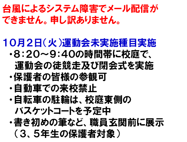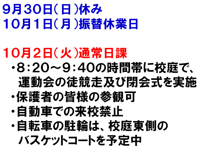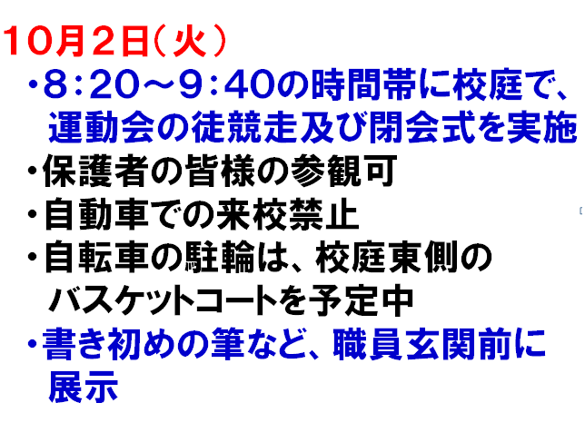10月2日(火)、雨天で実施できなかった徒競走と閉会式が、晴天の中行われました。多数の保護者の皆様のご来校、誠にありがとうございました。