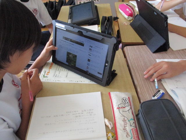 タブレット型PCが20台導入されました。教室でも調べる活動やまとめる活動が充実しています。また、何よりも、児童の意欲の高まりに期待です。写真は6年生の社会科の学習の一コマで、子どもたちは集中して課題に取り組んでいました。
