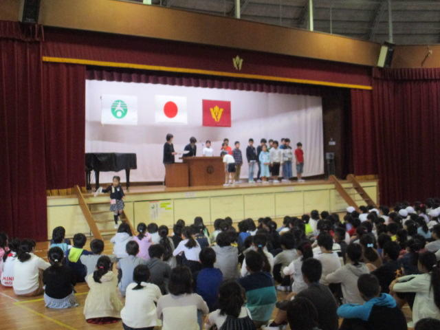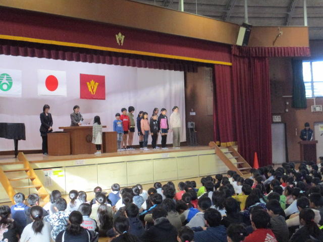 今朝は、持久走大会、人権作文、図工作品関係、音楽関係の表彰が行われました。嬉しい悲鳴ですが、表彰される子どもたちの数があまりにも多く、表彰朝会は2日間かけて行いました。