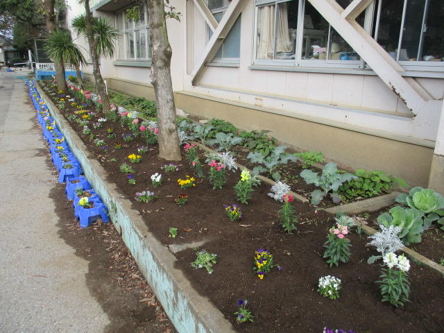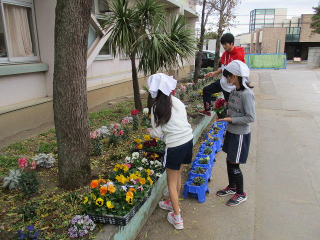 緑と花の運動事業に伴う草花の配布として、先日、公園緑地課からパンジー80ポットをいただきました。早速、子どもたちと花壇やプランターに植えました。学校にお立ち寄りの際には、是非、美しい草花をご覧ください。