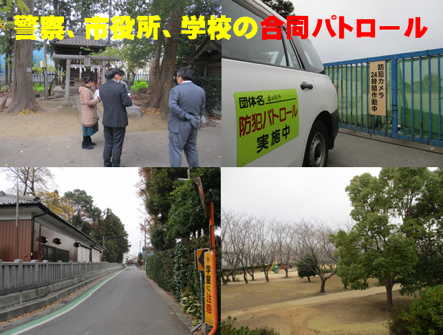 本日3日(月)14:00、春日部警察署、市役所(防犯対策課、施設課、保育課)、武里小の担当者が集まり、合同で通学路の危険箇所(施設や道路の危険箇所、不審者出没の事例がある箇所)の点検を行いました。手紙やメールでもお伝えしていますが、不審者に遭遇したまたはその情報を子どもから聞いた場合は、すぐに110番通報してください。