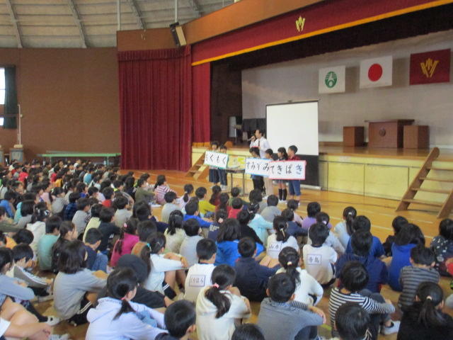 本日の児童集会では、図書委員会から武里読書まつりの説明、読書を進んで行いましょうという呼びかけがありました。なお、後期代表委員も行われ、各自の豊富が述べられました。
