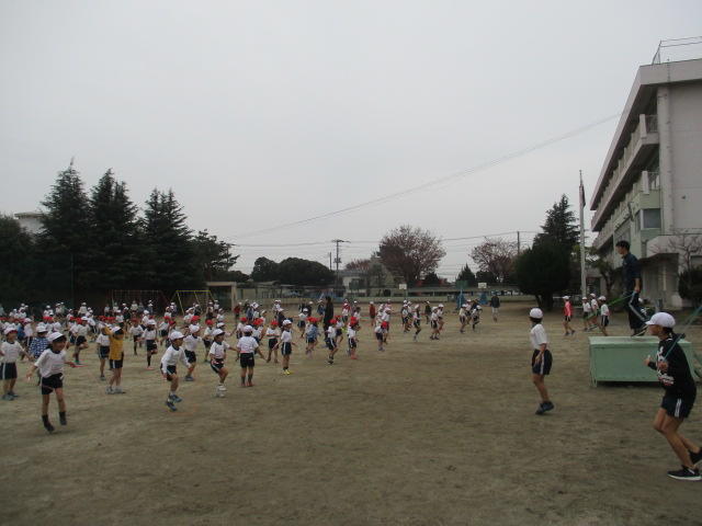 全校でリズムなわとびを行いました。子どもたちは、寒さに負けず、元気いっぱいになわとびに取り組みました。