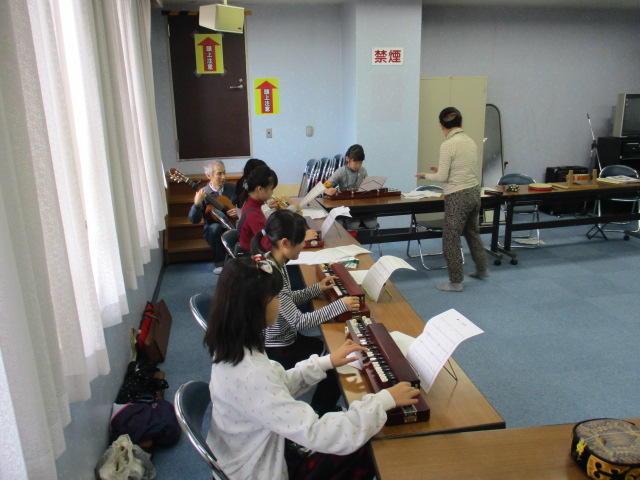 子供たちが三味線、尺八、箏を体験している一場面です。