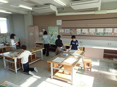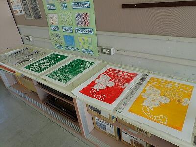 678組の子供たちが図工の学習です。ローラーにインクをつけて、バレンで版画を仕上げています。