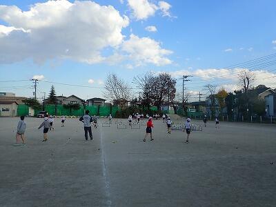 5年1組は体育。ハードル走の学習です。ハードル走は跳んで越えるではなく、リズミカルにハードルを越える