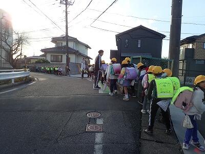 登下校ボランティアの皆さまに守られ、低学年が下校します。本校の緑コースの子供たちは、信号を渡ってから