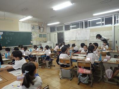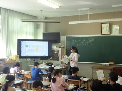 1校時は1年3組算数、単元名は「どっちがおおい」。
